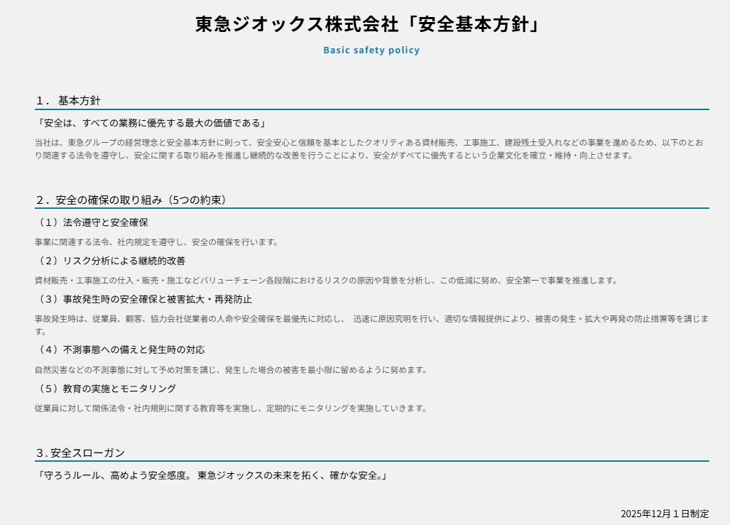 当社は、このたび「安全基本方針」を制定いたしましたので、お知らせいたします。