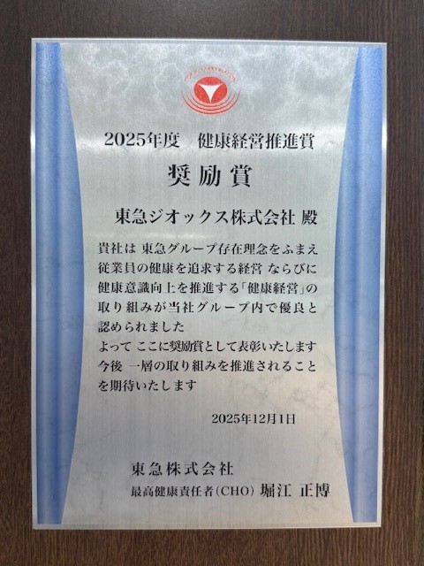 この度、東急グループの連結対象会社を対象として実施された「2025年度健康経営推進賞」において、当社の健康経営に関する取り組みが評価され「奨励賞」を受賞いたしました。